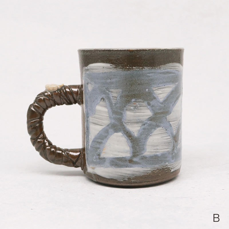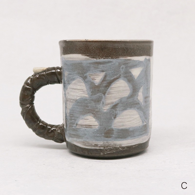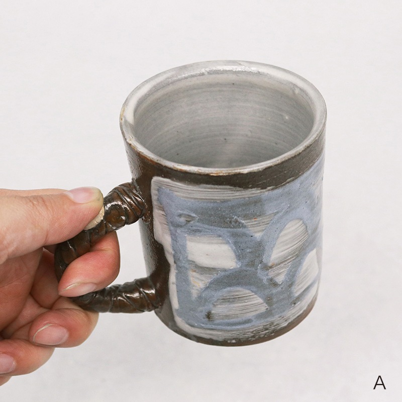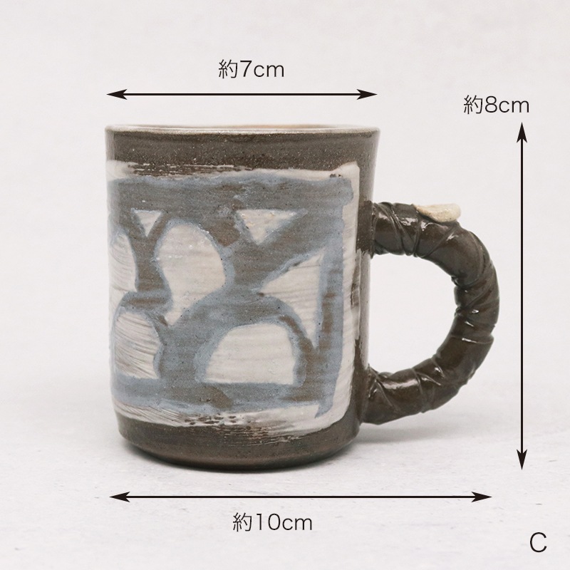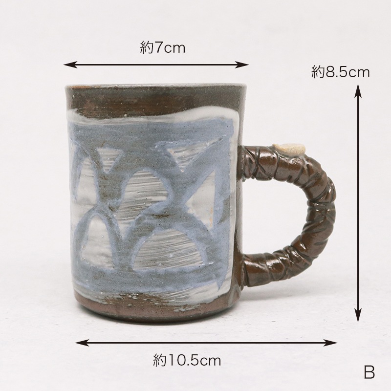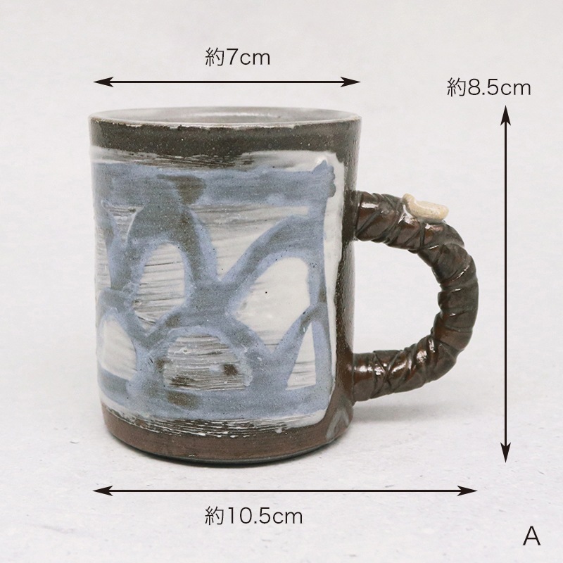 土の風合いを生かした、味わい深い作品を制作している貴志 勉さんのマグカップです。落ち着いた淡いブルーで描かれた波文の模様が特徴の作品です。大きすぎず小さすぎずの丁度良いサイズ感で、朝のコーヒータイムや午後のティータイムといった日常使いに最適です。
