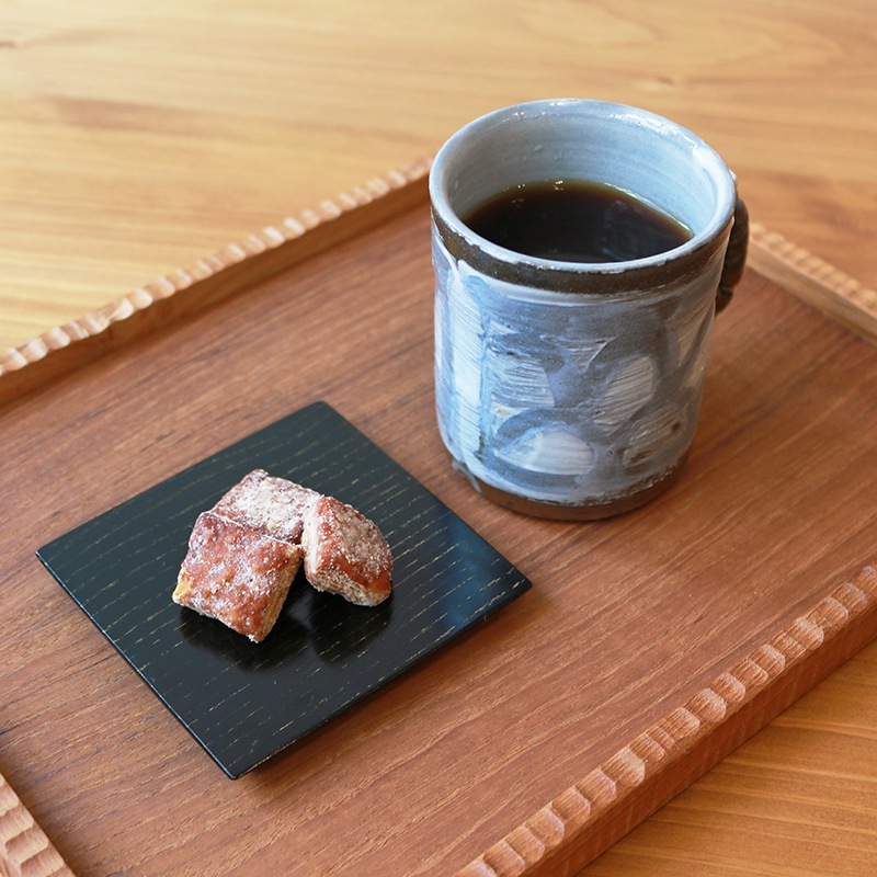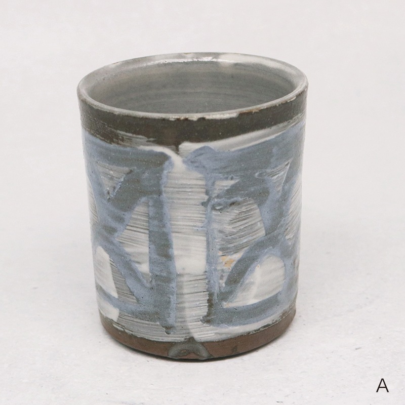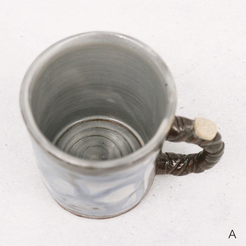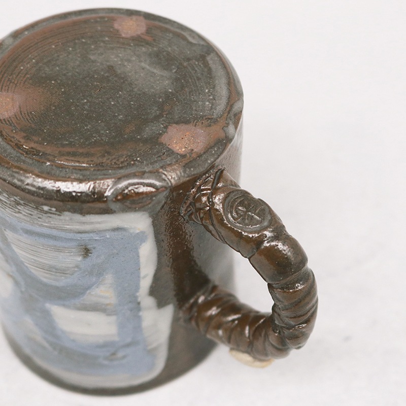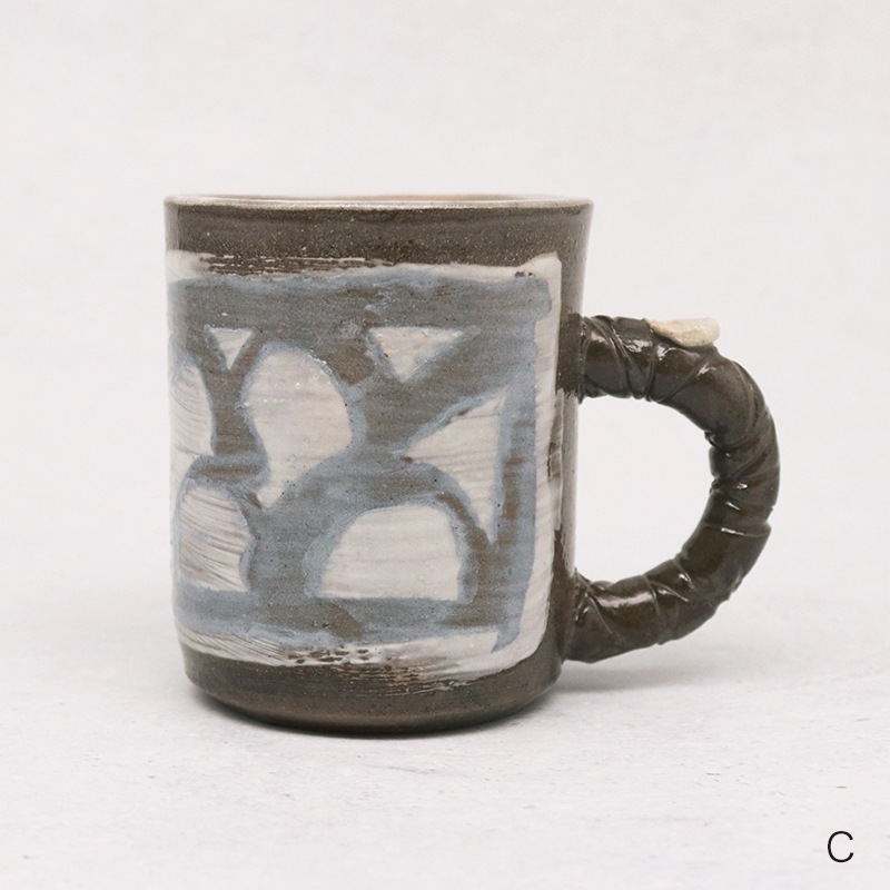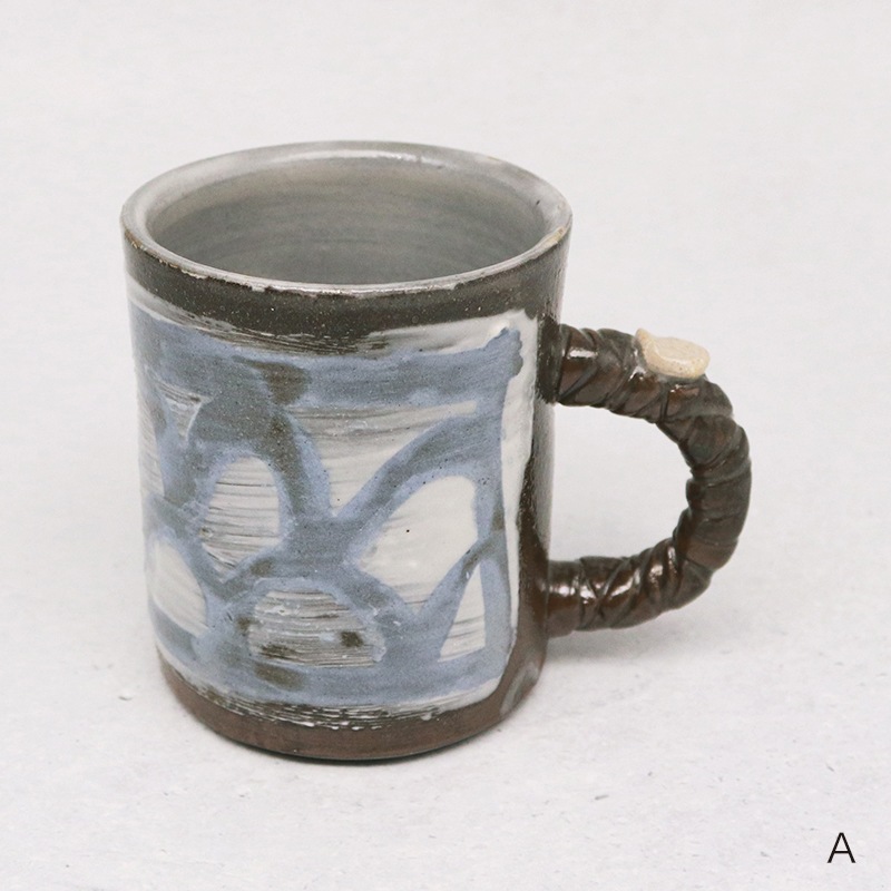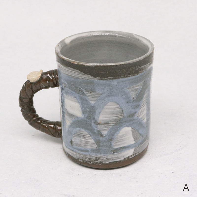 土の風合いを生かした、味わい深い作品を制作している貴志 勉さんのマグカップです。落ち着いた淡いブルーで描かれた波文の模様が特徴の作品です。大きすぎず小さすぎずの丁度良いサイズ感で、朝のコーヒータイムや午後のティータイムといった日常使いに最適です。