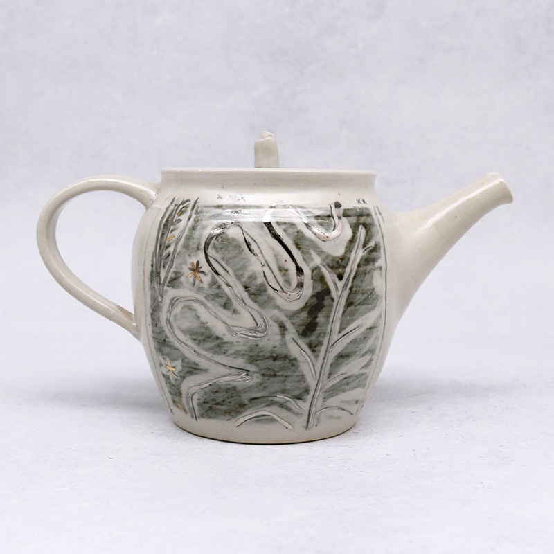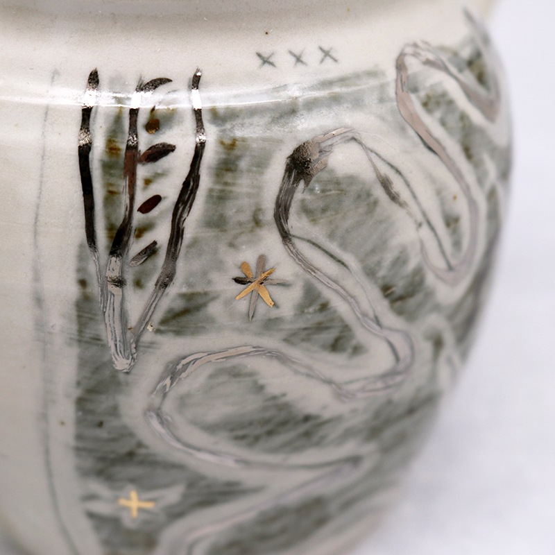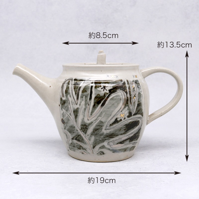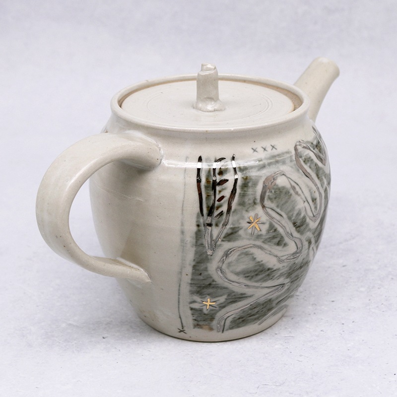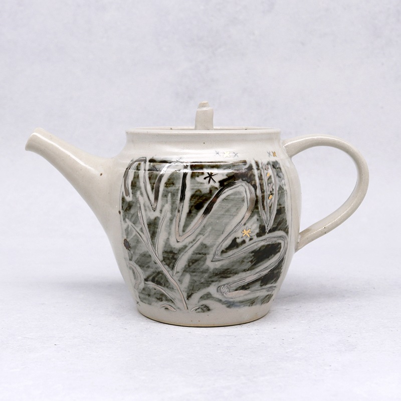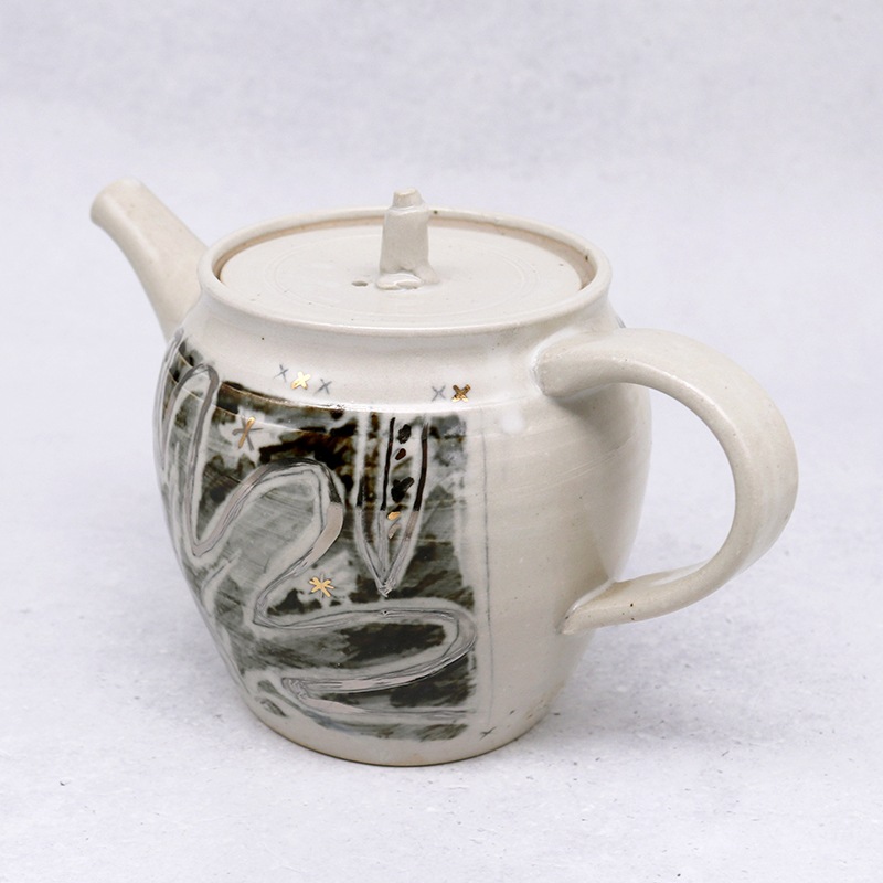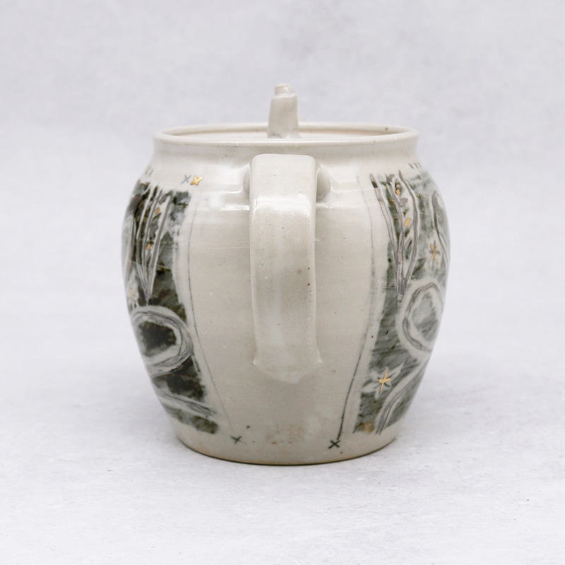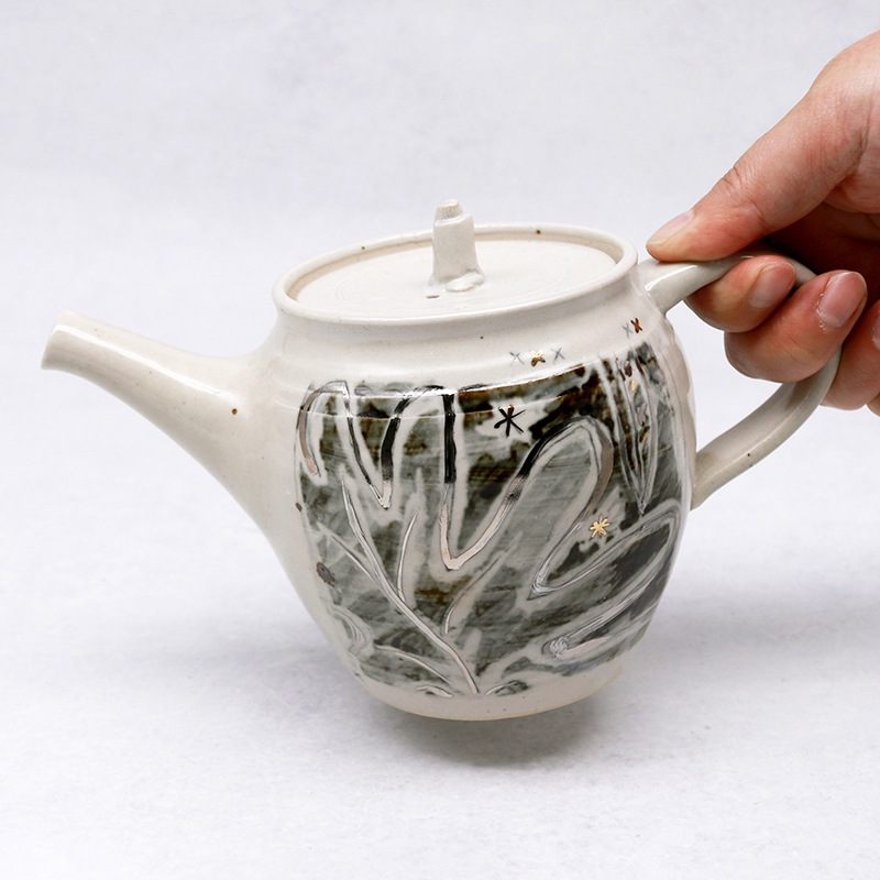 土の風合いを生かした、味わい深い作品を制作している貴志 勉さんの奥様・博子さんの急須です。お茶時間を豊かにする手作りの急須は、使い込んでいくうちに愛着が湧いていきそうですね。こちらの銀彩の急須は、まるで絵本のような世界観。インテリアとして置いておくだけでもおしゃれです。