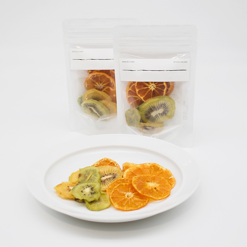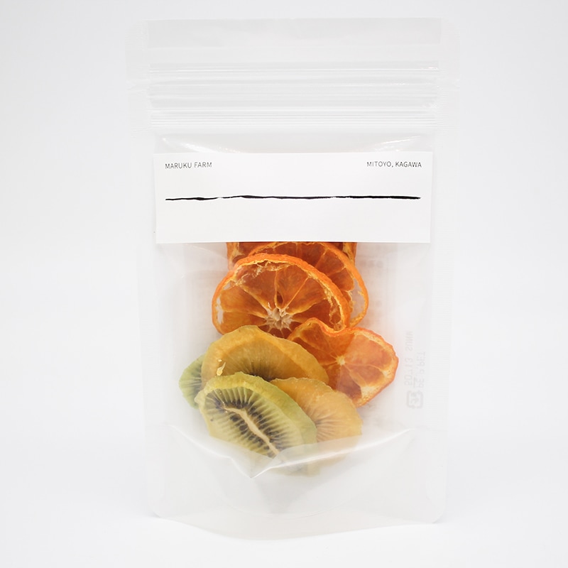 自然豊かな三豊市仁尾町にある「まるく農園」で、一つひとつ丁寧に育てたキウイフルーツやみかんを無添加でドライに。一番美味しい完熟の瞬間を見極め、砂糖を加えず素材そのものの甘みを最大限にいかしました。