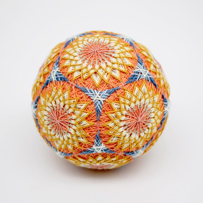 香川に昔から伝わる讃岐の手まりです。木綿糸を丁寧に自然の草木から染めて作られます。何種類ものかがり模様や個性あふれる色合いが魅力です。全て手仕事ですので、世界にひとつだけの手まりをお楽しみください。