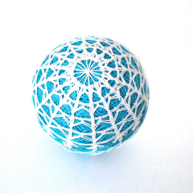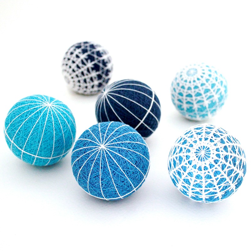 手まりの魅力は、かがり模様の美しさだけでなく、木綿の糸の手触りや染めた時の色が時間とともに変化していくことで愛着がわき、ずっと手元に置いておきたいと思うところです。その手まりをご自宅で作れる、土台と糸のセットです。