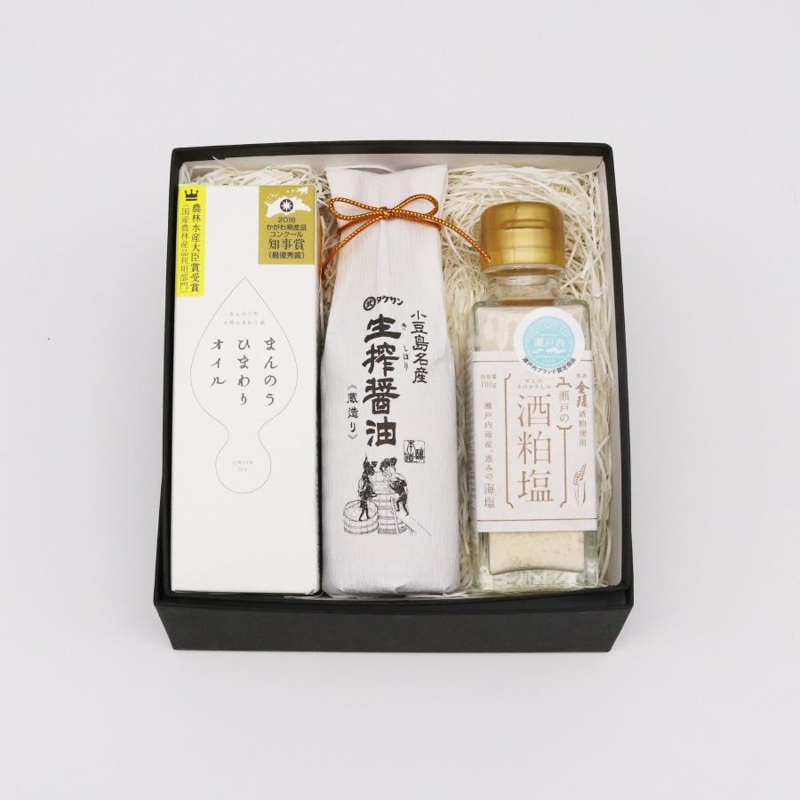 IKUNASおすすめの塩、醤油、ひまわりオイルのセット。ちょっとした贈りものに、特別な調味料を。