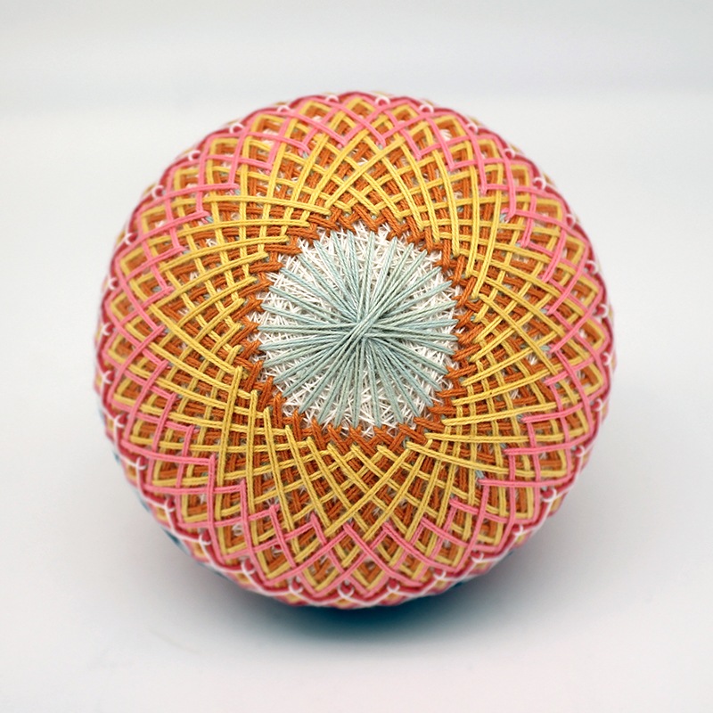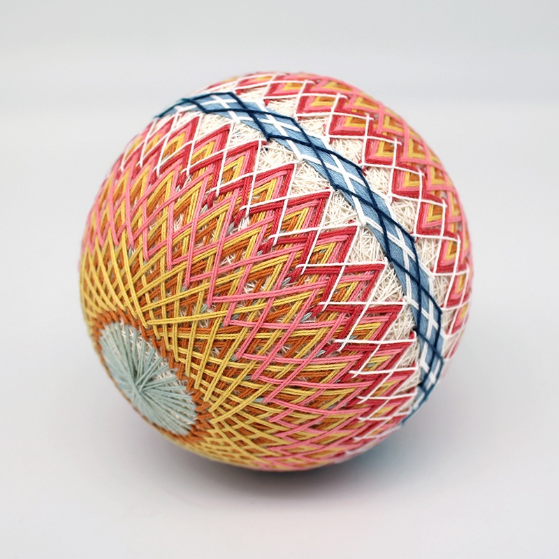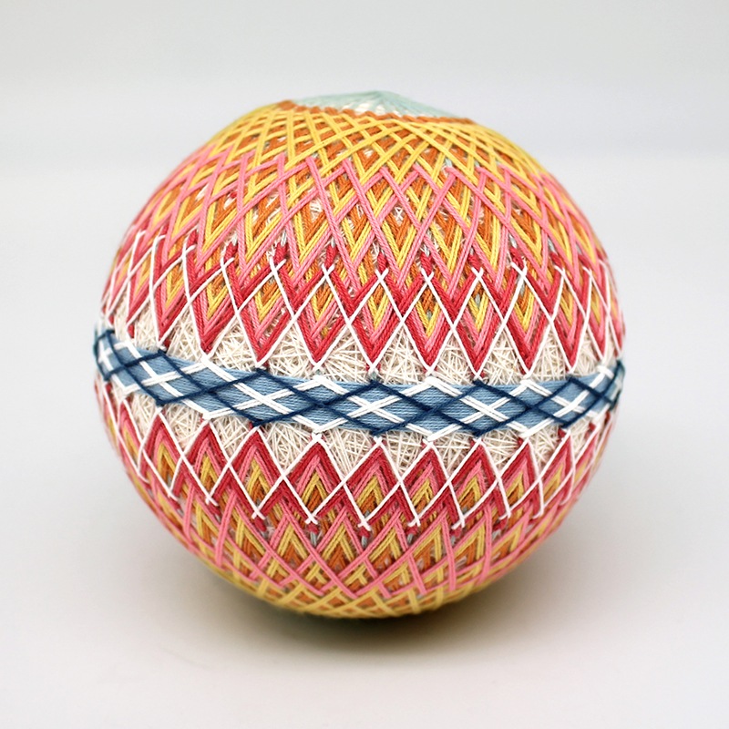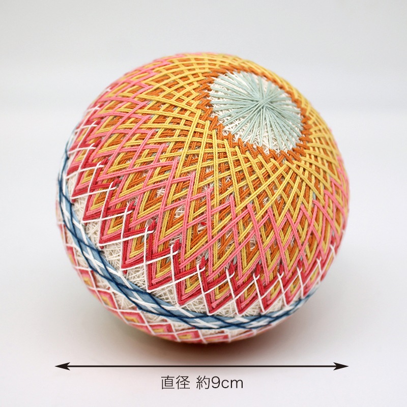 香川に昔から伝わる讃岐の手まりです。木綿糸を丁寧に自然の草木から染めて作られます。何種類ものかがり模様や個性あふれる色合いが魅力です。全て手仕事ですので、世界にひとつだけの手まりをお楽しみください。