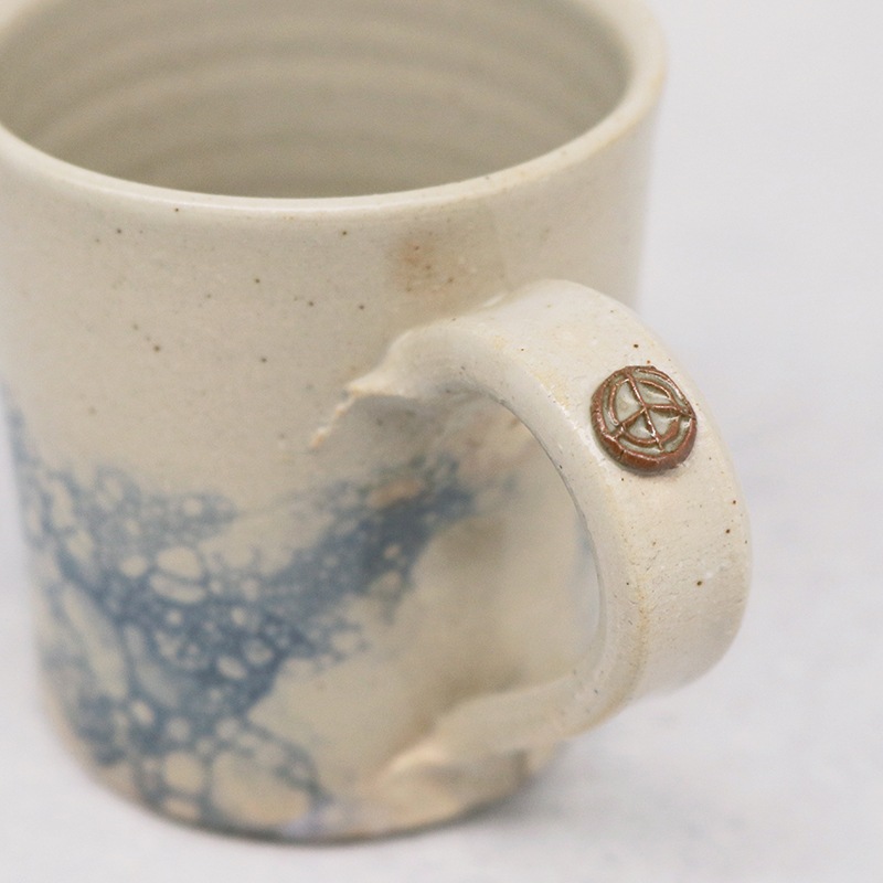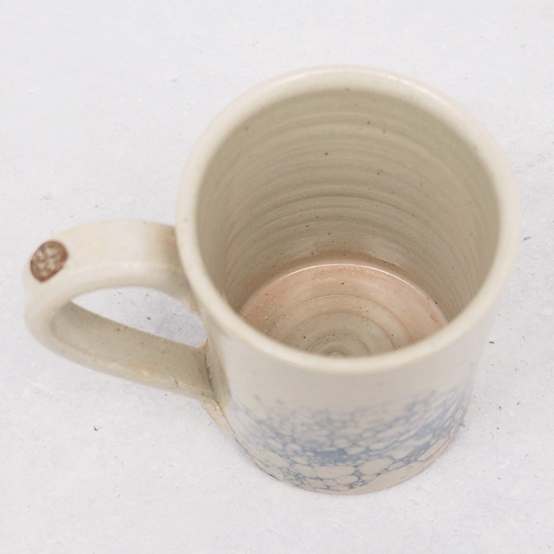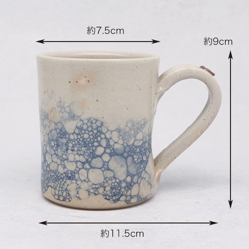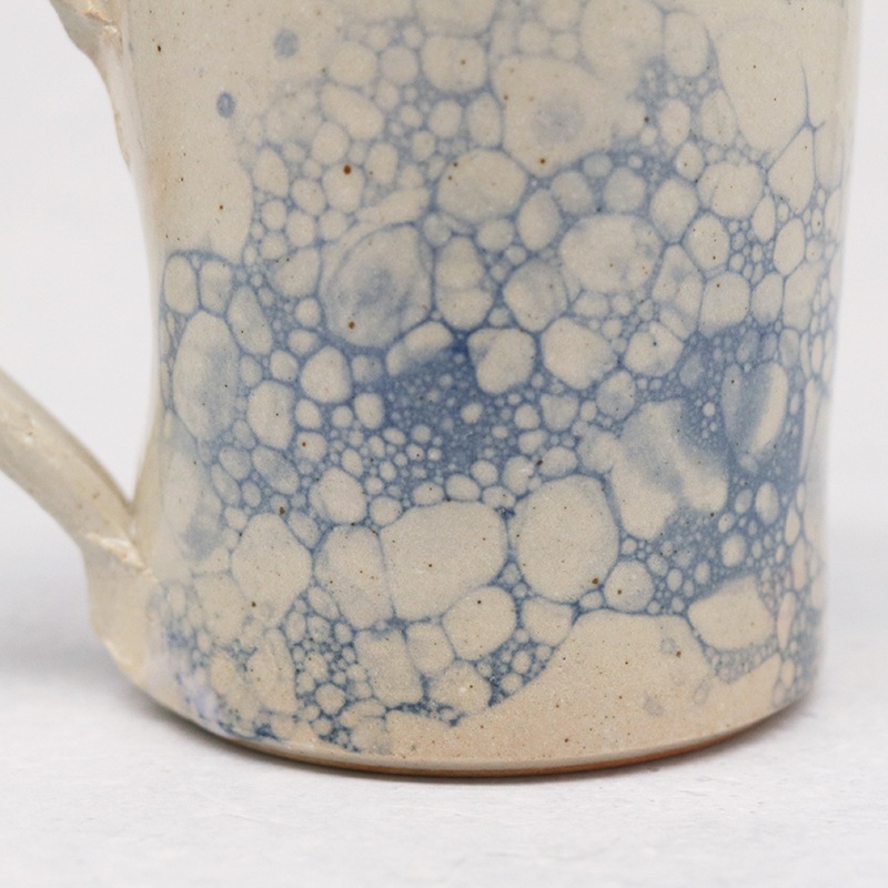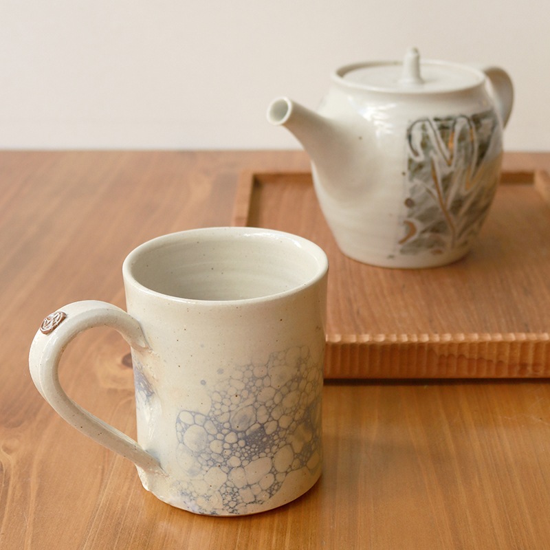 土の風合いを生かした、味わい深い作品を制作している貴志 勉さんのマグカップです。儚く美しい泡影の模様が特徴の作品です。朝のコーヒータイムや午後のティータイムといった日常使いに最適です。