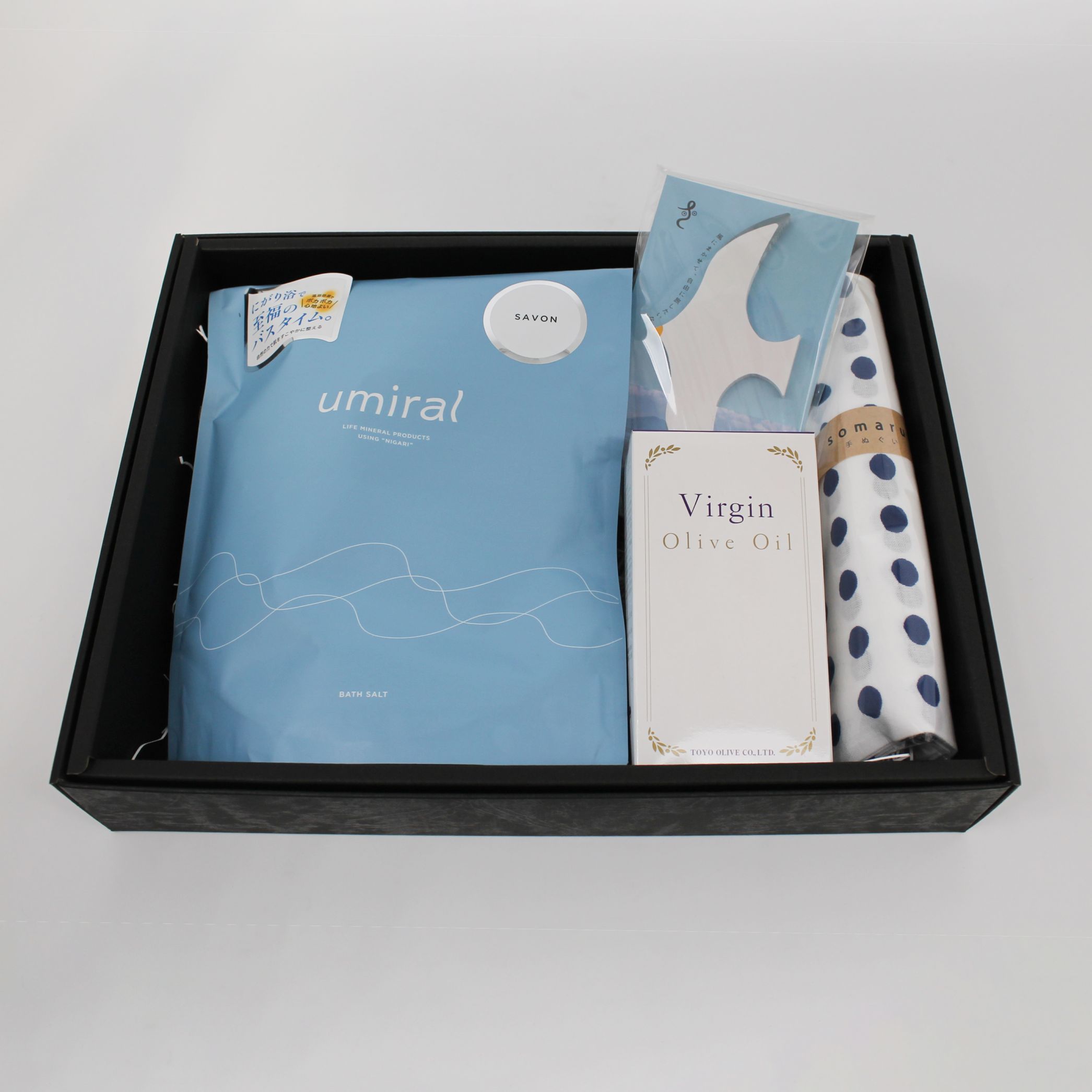 【商品内容】 umiral バスソルト・サボン、バージンオリーブオイル、shimamemo はばたくカモメ、染料手ぬぐい 讃岐のドット