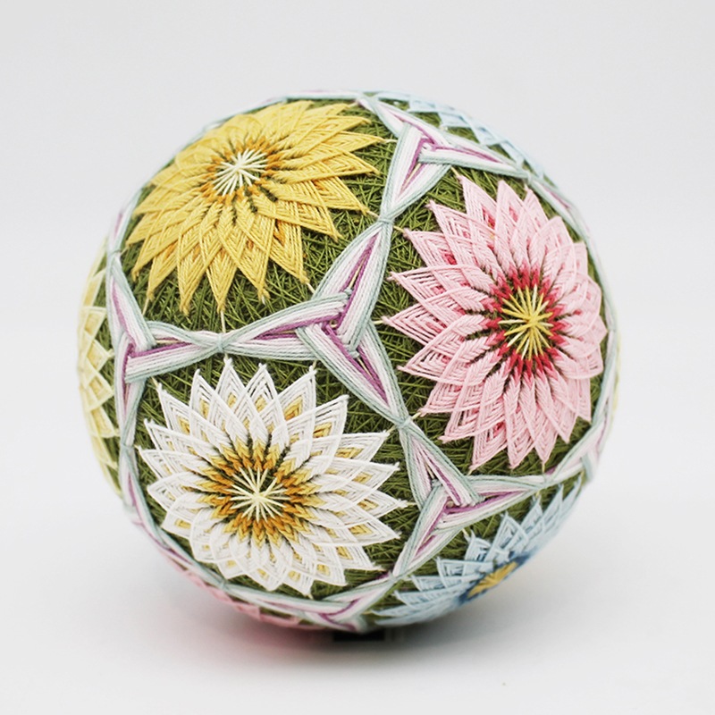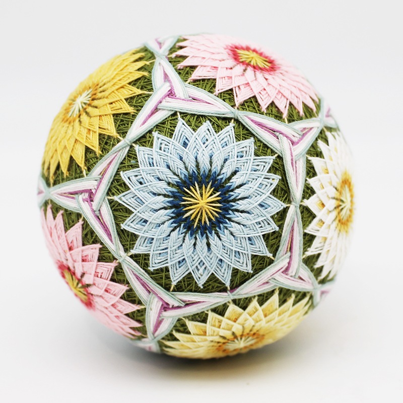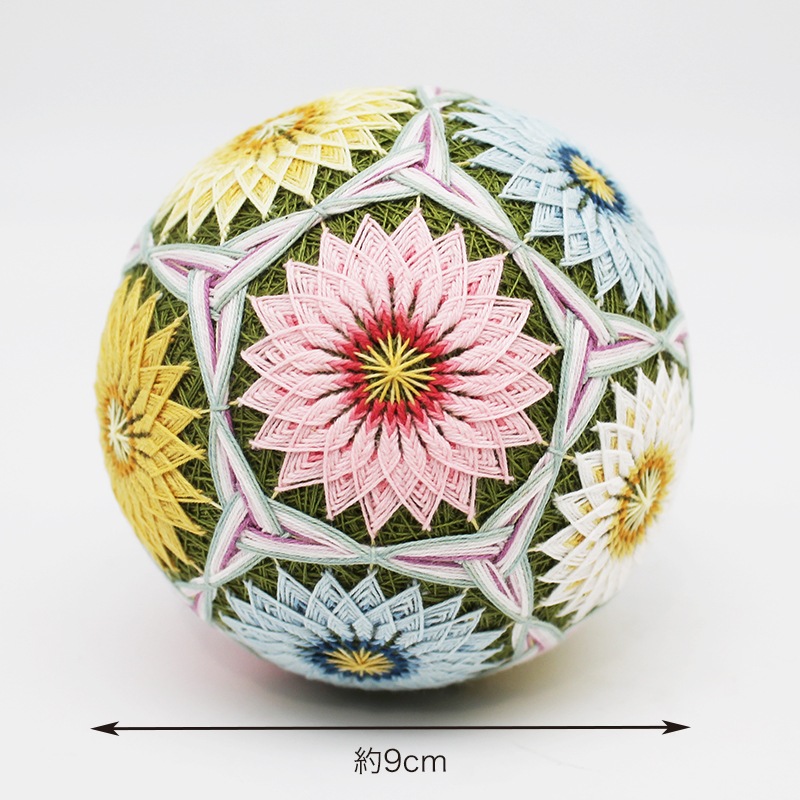 香川に昔から伝わる讃岐の手まりです。木綿糸を丁寧に自然の草木から染めて作られます。何種類ものかがり模様や個性あふれる色合いが魅力です。全て手仕事ですので、世界にひとつだけの手まりをお楽しみください。